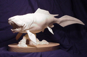 Dunkleosteus: Approx.1/20 scale, (15.5 inches in length). 6 piece cast, body, lower jaw and pectoral fins separate. Included is a resin coral reef styled base as well as an oval pine base for display. The model comes unpainted easy to assemble with a minimum amount of preparatory cleanup before being ready to paint. Dunkleosteus cost $184.50 plus $16.50 for shipping and handling within the U.S. (Orders out side the U.S. contact for specific shipping quote before ordering.)